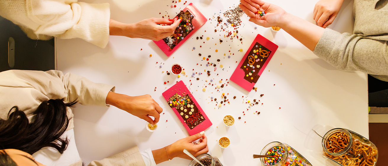 Schokolade macht glücklich! Im CHOCOVERSUM gehst Du diesem Phänomen mit allen Sinnen auf die Spur. In einer 90-minütigen Führung begleitest Du die Kakaobohne auf ihrem spannenden Weg vom Anbau bis zur fertigen Tafel Schokolade. Probieren und Mitmachen sind dabei ausdrücklich erwünscht! Genieße an jeder Fertigungsstufe eine Kostprobe und kreiere sogar Deine eigene Tafel Schokolade!