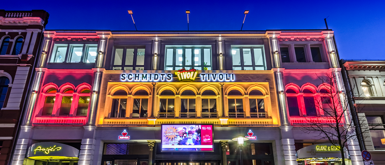 Schrill, schräg und (s)charmant: Die drei Schmidt-Bühnen – Schmidts Tivoli, Schmidt Theater und Schmidtchen – garantieren beste Unterhaltung mitten auf der Reeperbahn. Und das seit 1988! Eigene Musicalproduktionen wie der Dauerbrenner „Heiße Ecke“ – Das St. Pauli Musical oder „Die Königs schenken nach“, bunte Shows und Revuen wie „Oberaffengeil“, jede Menge Kindertheater für die ganze Familie und viele hochkarätige Gastspiele begeistern über 400.000 Gäste jährlich in Deutschlands erfolgreichstem Privattheater. Und fürs leibliche Wohl ist auch gesorgt: Alle drei Bühnen sind Verzehrtheater mit Service am Platz.