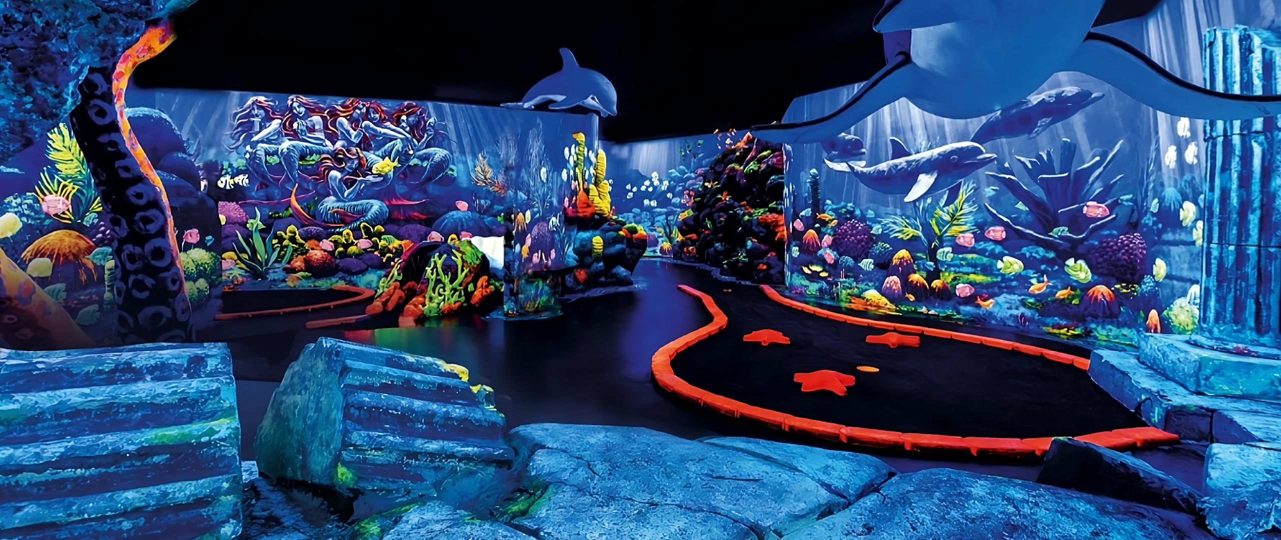 Tauchen Sie mit dem U-Boot in ein Feuerwerk der Farben und spielen Sie Minigolf der neuen Dimension. Staunen Sie sich durch geheimnisvoll leuchtende Schwarzlichtwelten.