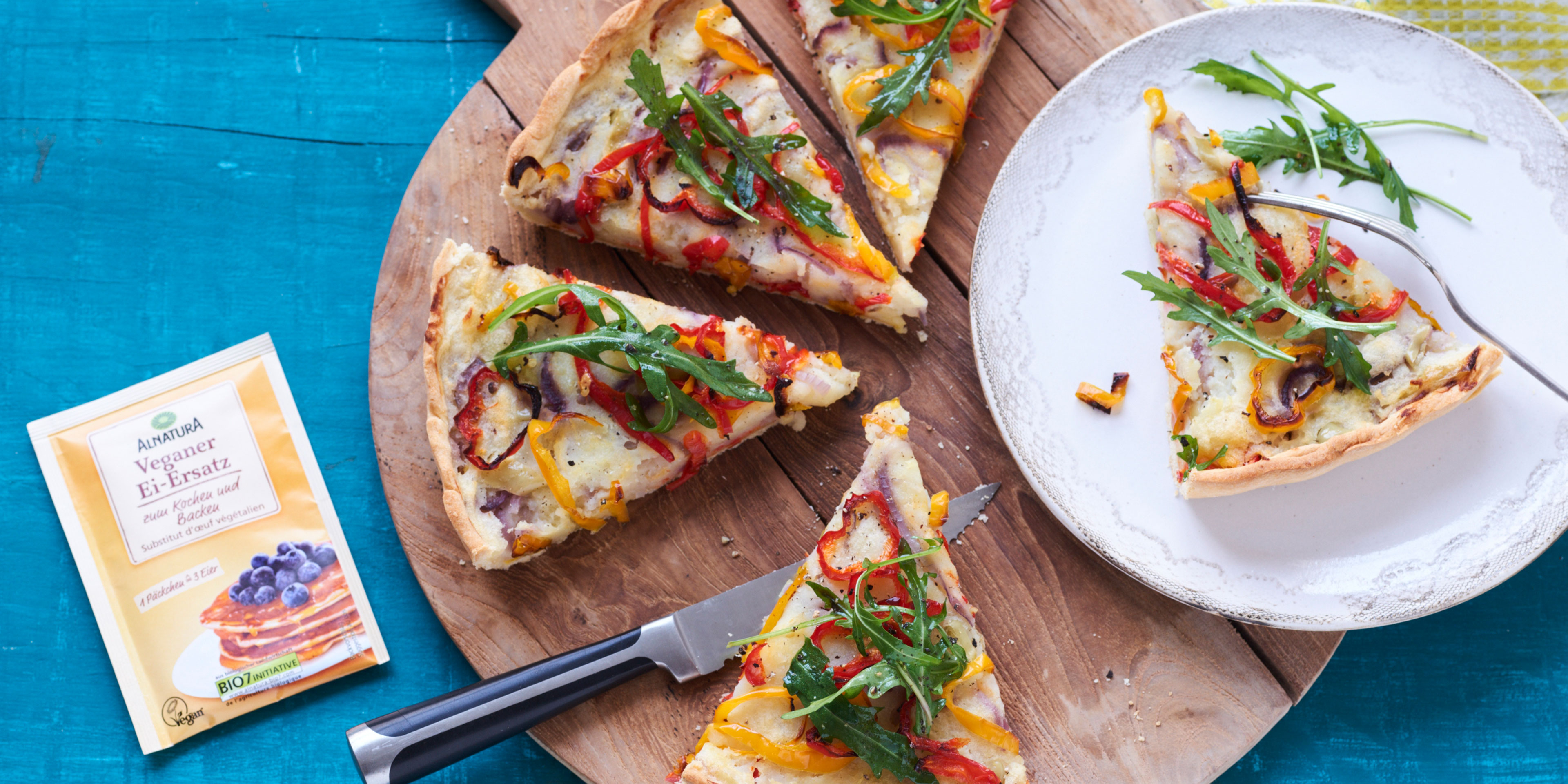 - Inzwischen in einer Schüssel Ei-Ersatz mit Mineralwasser mischen und mit einem Schneebesen verquirlen. ½ TL Salz, Margarine und Mehl zugeben und die Masse zügig zu einem glatten Teig verkneten. Diesen abgedeckt im Kühlschrank 30 min ruhen lassen.